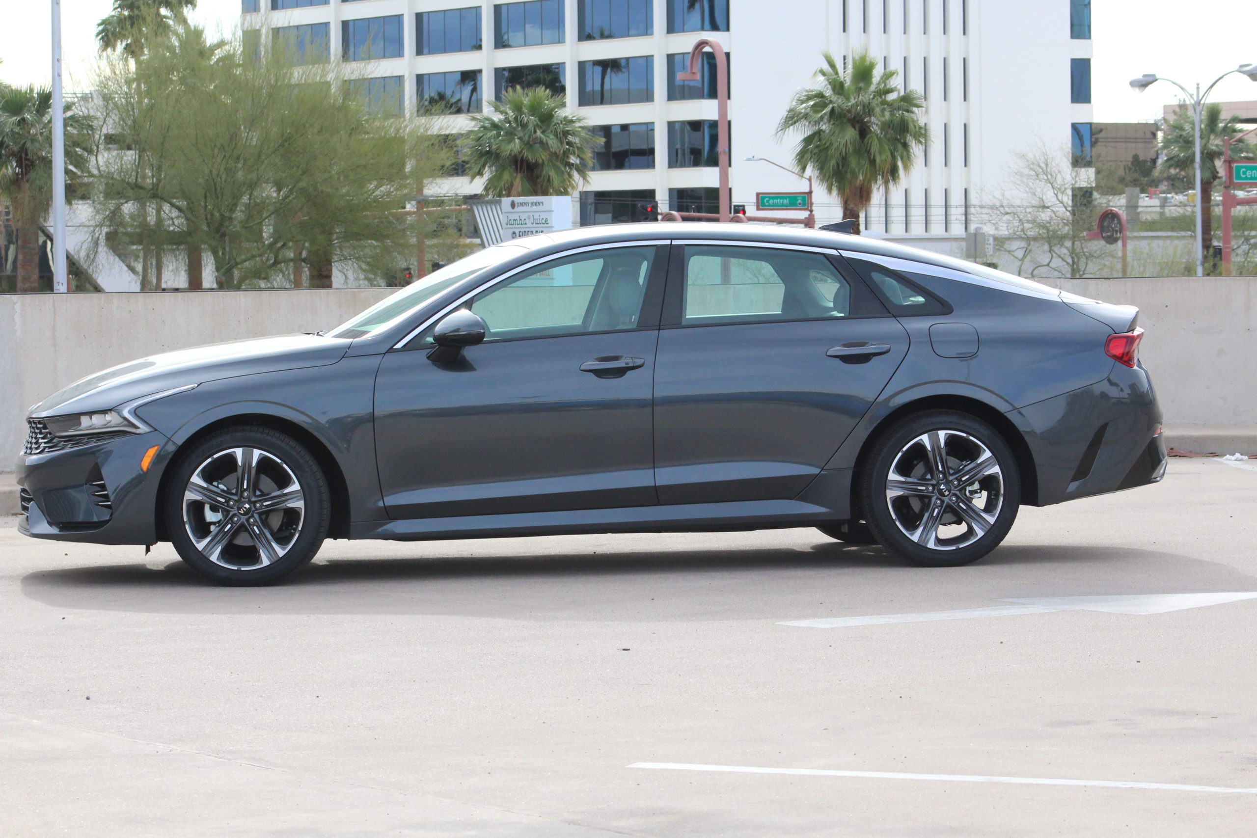 El K5 básico solo cuesta $ 100 más que el Optima saliente. También ofrece el modelo GT significativamente más deportivo, al que le encanta freír los neumáticos delanteros con su motor de 290 CV. Aquellos a quienes no les importa tener el motor más potente, pero quieren algunos de los elementos más atrevidos del GT pueden considerar el GT-Line.Viene de serie con un kit de carrocería más deportivo y rines de 18 pulgadas, un asiento del conductor ajustable eléctricamente en 10 direcciones, un volante forrado en cuero y puertos de carga para los pasajeros del asiento trasero. Aquellos que quieran tracción en las cuatro ruedas pueden agregarlo por $ 3700. Esta actualización también incluye control de crucero adaptativo, faros LED completos, volante con calefacción, techo corredizo panorámico y carga inalámbrica.
