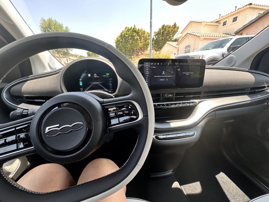 When you enter the cabin, you’ll notice the comfortable seats emblazoned with “FIAT.” The two-tone flat-bottomed steering wheel looks and feels great. I appreciate the modern materials used throughout the cabin, which avoid the appearance of cheapness despite a lot of plastic. The oval gauge cluster is easy to read, with a prominent digital speedometer in the middle and battery range and percentage information. The transmission is operated through push buttons located below the center screen.
