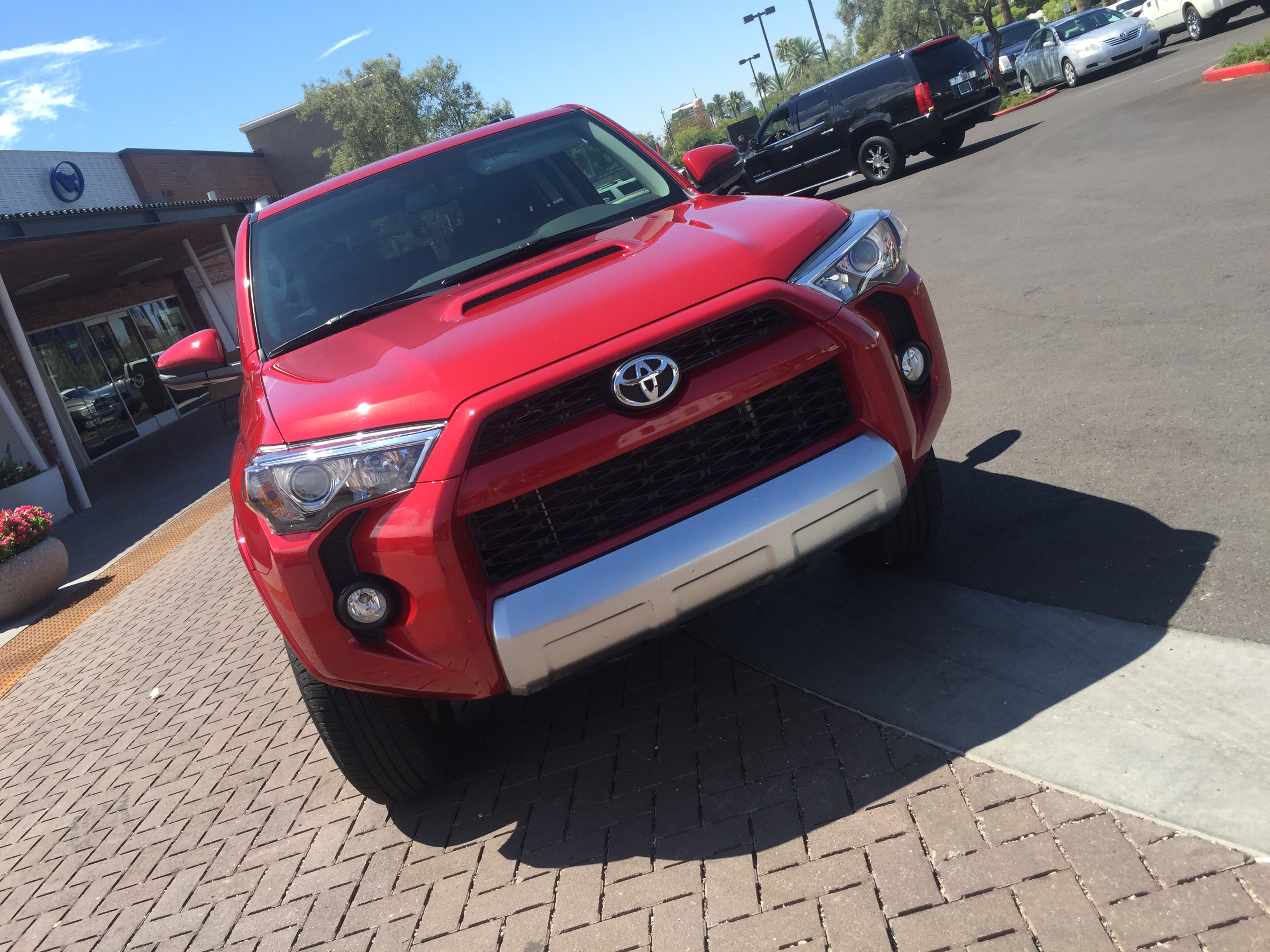 The Toyota 4 Runner in its Barcelona red catches your eye and its rear-wheel -drive layout, a body on frame platform, ample ground clearance,Nitto all terrain tires, TRD front springs as well as TRD trim and badging, mouthy grill and the cool awesome feature you can lower the liftgate window you know you can embark on your adventure trip in this top selling cross-over SUV through any rugged terrain.