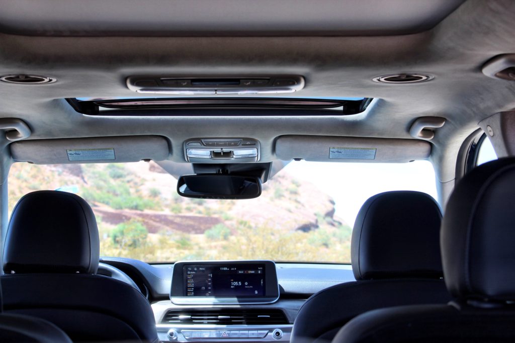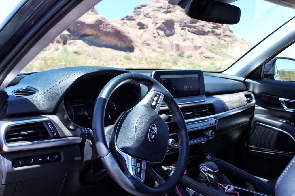 La Kia Telluride esta propulsada por un motor 3.8 litros V-6 de 291 hp y 262 libras-pie de torque, con una transmisión automática de ocho velocidades. El cual manda la potencia a las todas las ruedas motrices (AWD) o tracción delantera dependiendo de la versión que se haya elegido. La Telluride se pude manejar en modo Smart, Comfort, y Sport puesta en modo sport es rápida para una SUV de tres filas – digamos que acelera a 60 millas por hora en solo 7.2 segundos. Otro punto a su favor es que tiene buena capacidad de remolque hasta 5,000 libras. Perfecta para ir de campamento.