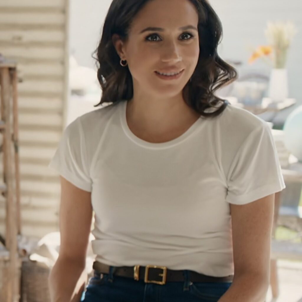 The Duchess embraced a California-inspired garden look, wearing a vibrant JJ shirt in the beautiful “Juane” shade from Heidi Merrik. She paired it effortlessly with stylish jeans from Ayr. This combination showcased her unique sense of fashion and individuality.