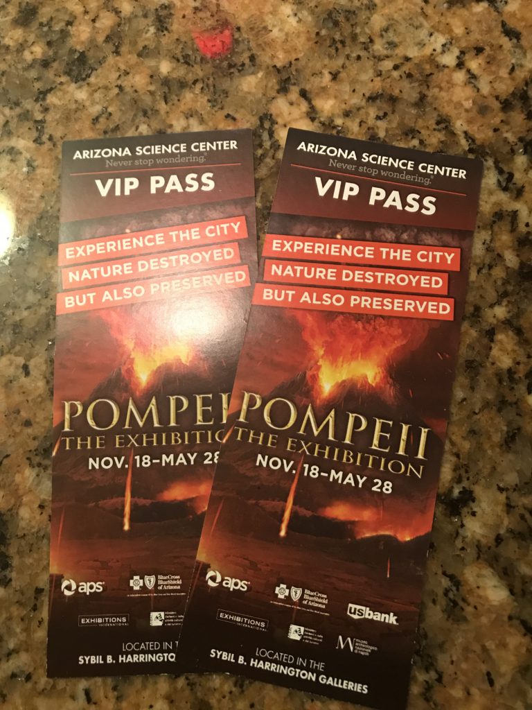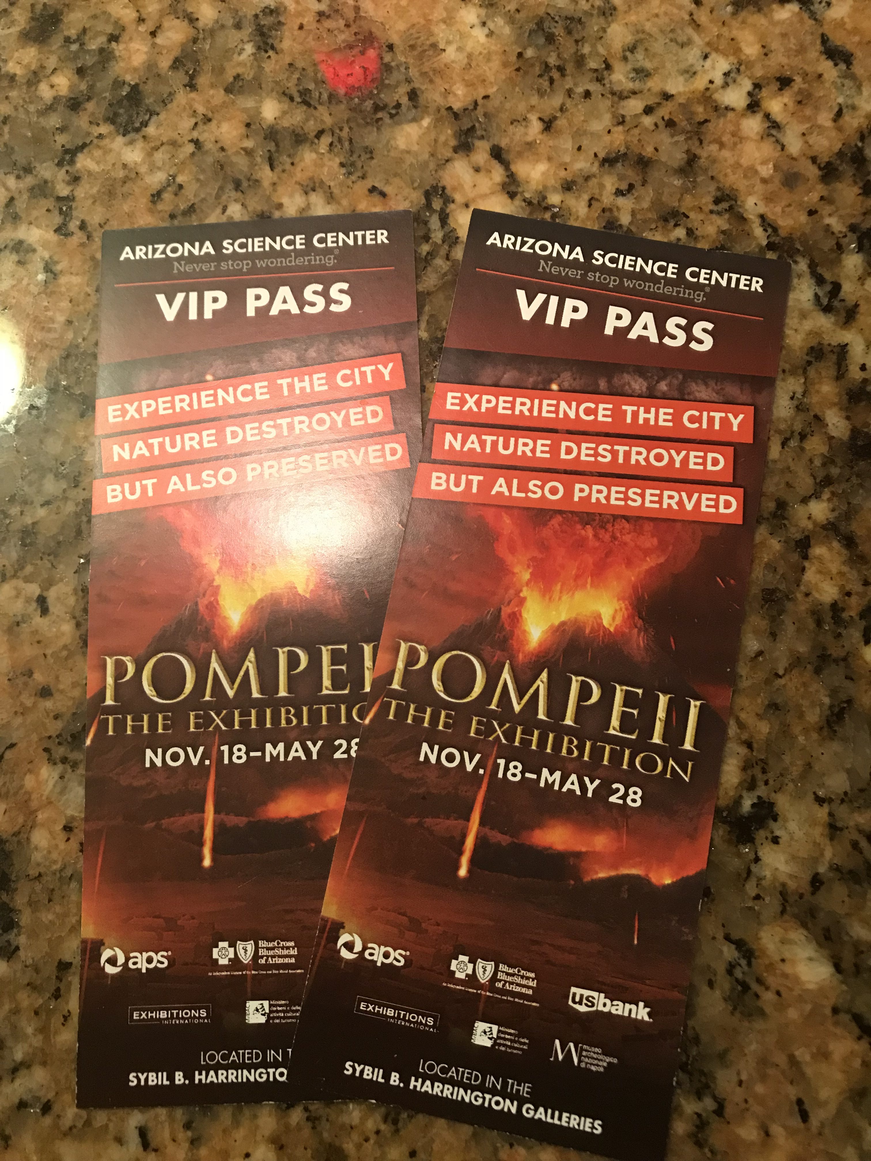 If you love History, you can not miss POMPEII: The Exhibition. The third floor of the Arizona Science Center has been transformed in to the ancient city of POMPEII. The exhibit not only showcases ancient artifacts but also has an interactive theater setting, where you will experience the catastrophic eruption Mount Vesuvius. Even though it destroyed the city at the same time it preserved it for all of us to experience. The exhibit last day in Phoenix is May 28th.